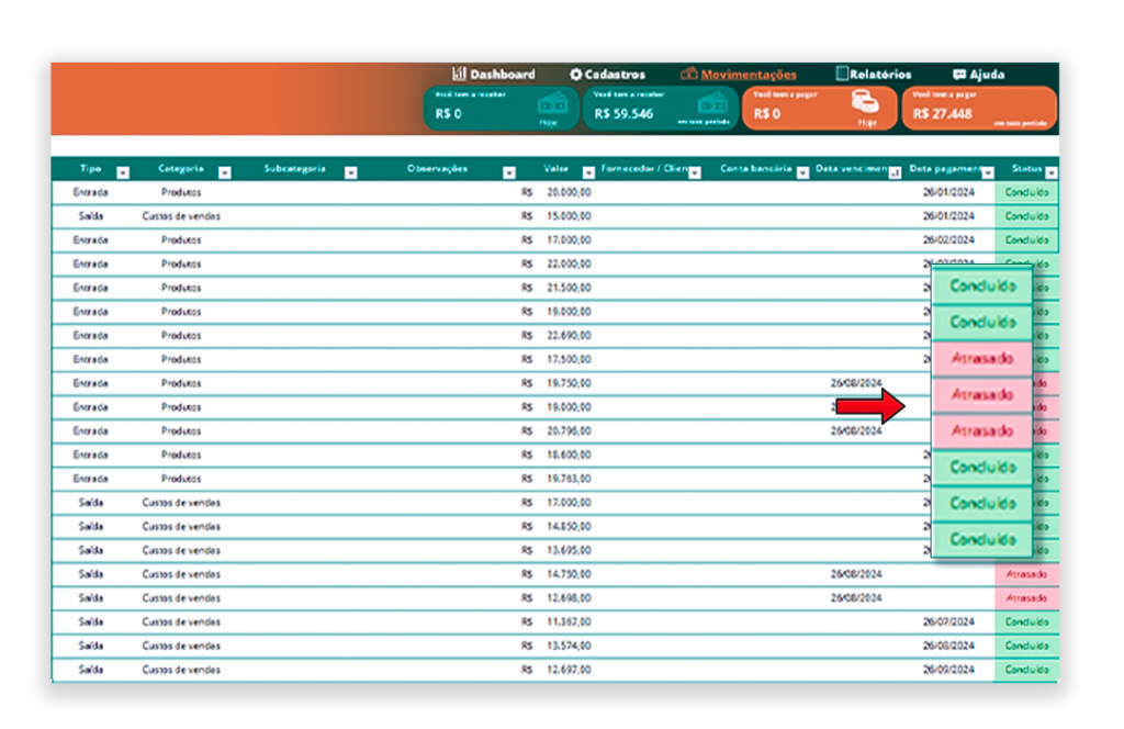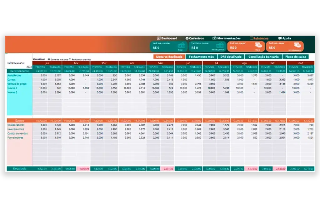 Tenha um controle detalhado de todas as entradas e saídas financeiras da sua empresa ao longo dos meses, juntamente com um mini gráfico evolutivo.