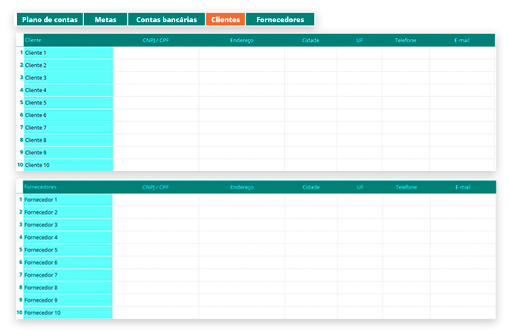 Registre as principais informações dos seus clientes e fornecedores, como nomes, contatos, endereço e condições comerciais.